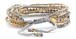 This Chan Luu bracelet features 8 uniquely patterned strands of gold and silver seed beads with glistening Coated Silver Chinese crystals. Accessorize your wrist with this design and layer it with your favorite combination of gold or silver tone jewelry to complete your look. This style has a macramé pull cord closure that easily adjusts to your ideal fit.